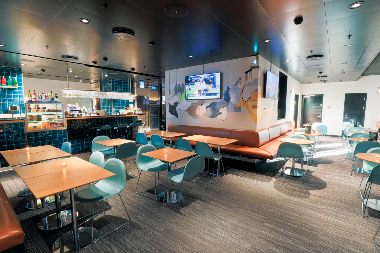 I huset finder I også vores bar og café BAR50 med udsigt over vandet, tv og brætspil samt opholdsrum i underetagen med pool, airhockey og andre hyggelige aktiviteter.