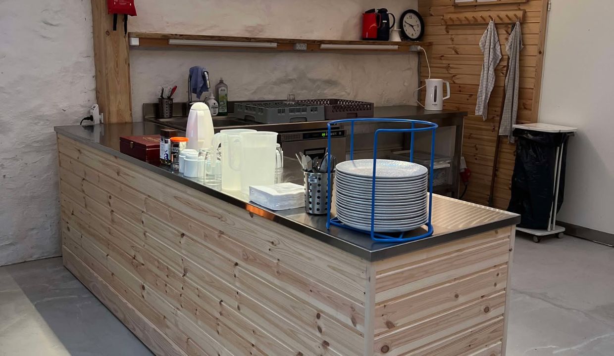 Laden kan bookes som base til jeres dagsarrangement – her er alt, hvad I skal bruge, lige fra service og køleskab til toilet- og badefaciliteter.