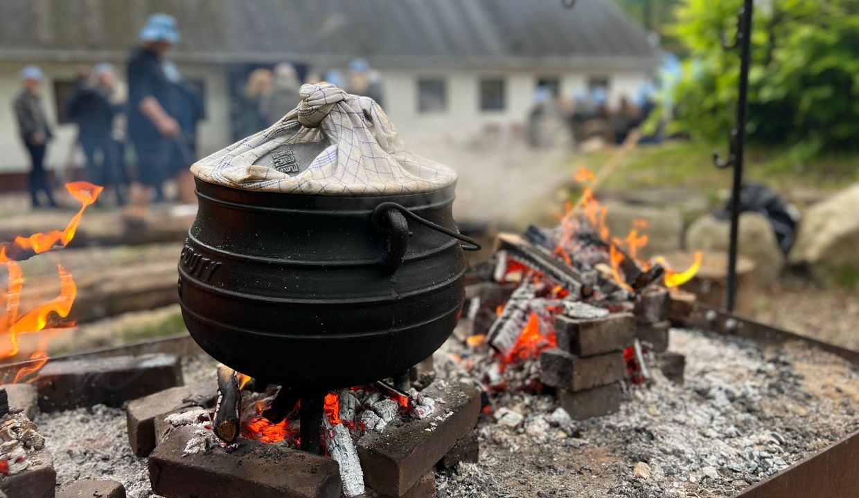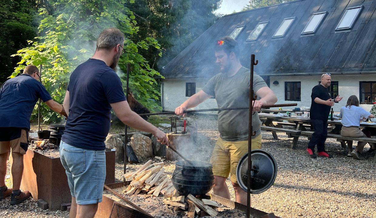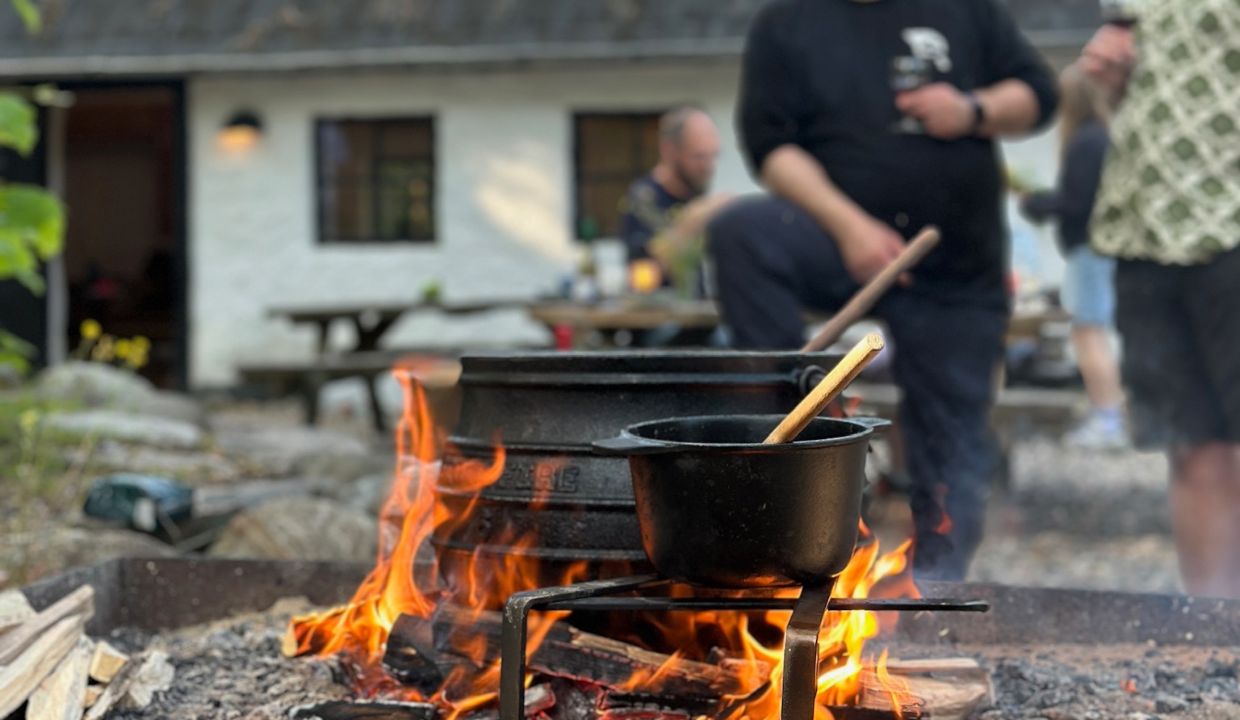 Udenfor er der rig plads til fællesskab omkring bål og madlavning. Når gryden simrer, og snakken går, mærker man hurtigt roen fra skoven omkring Sletten.