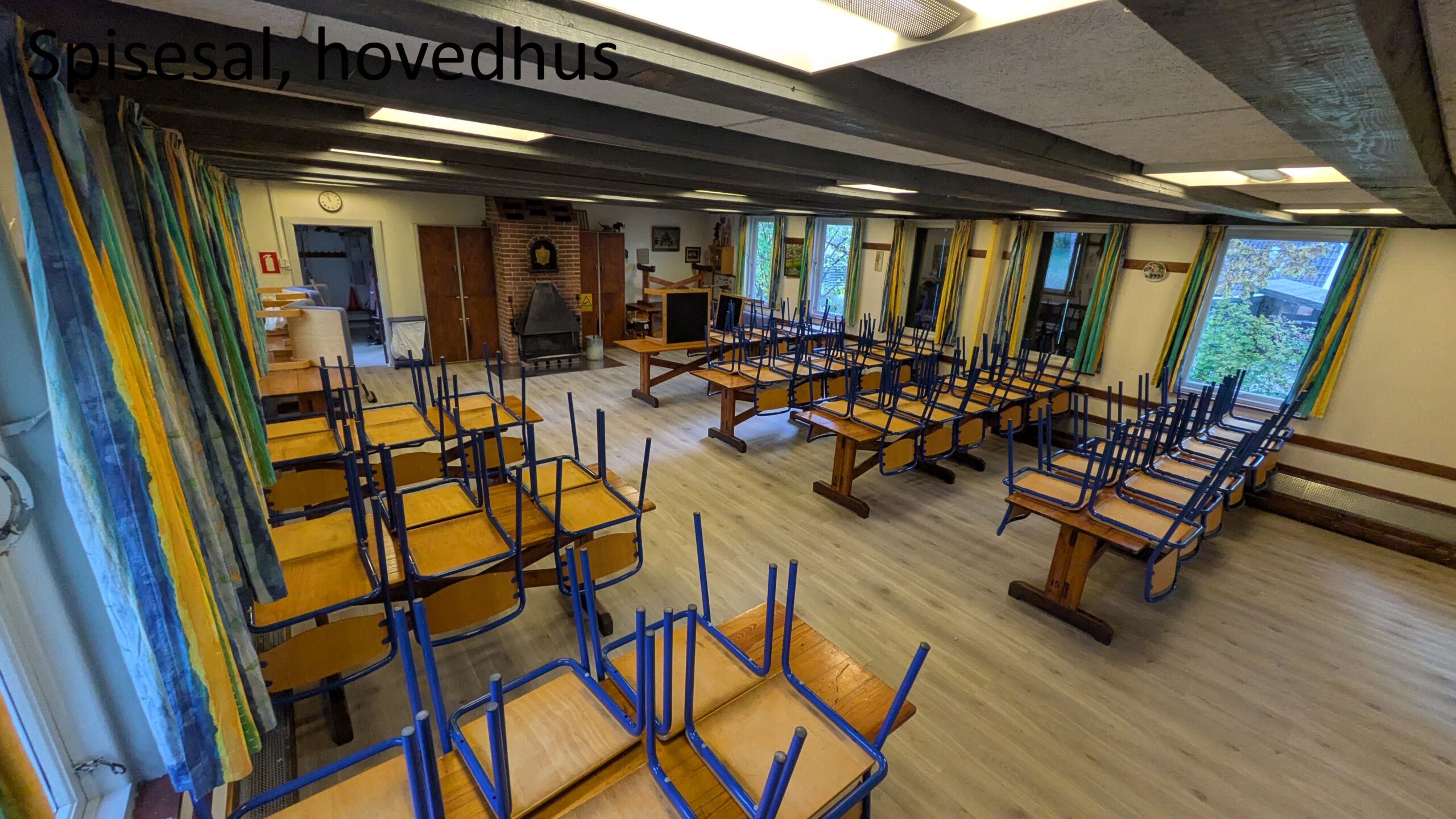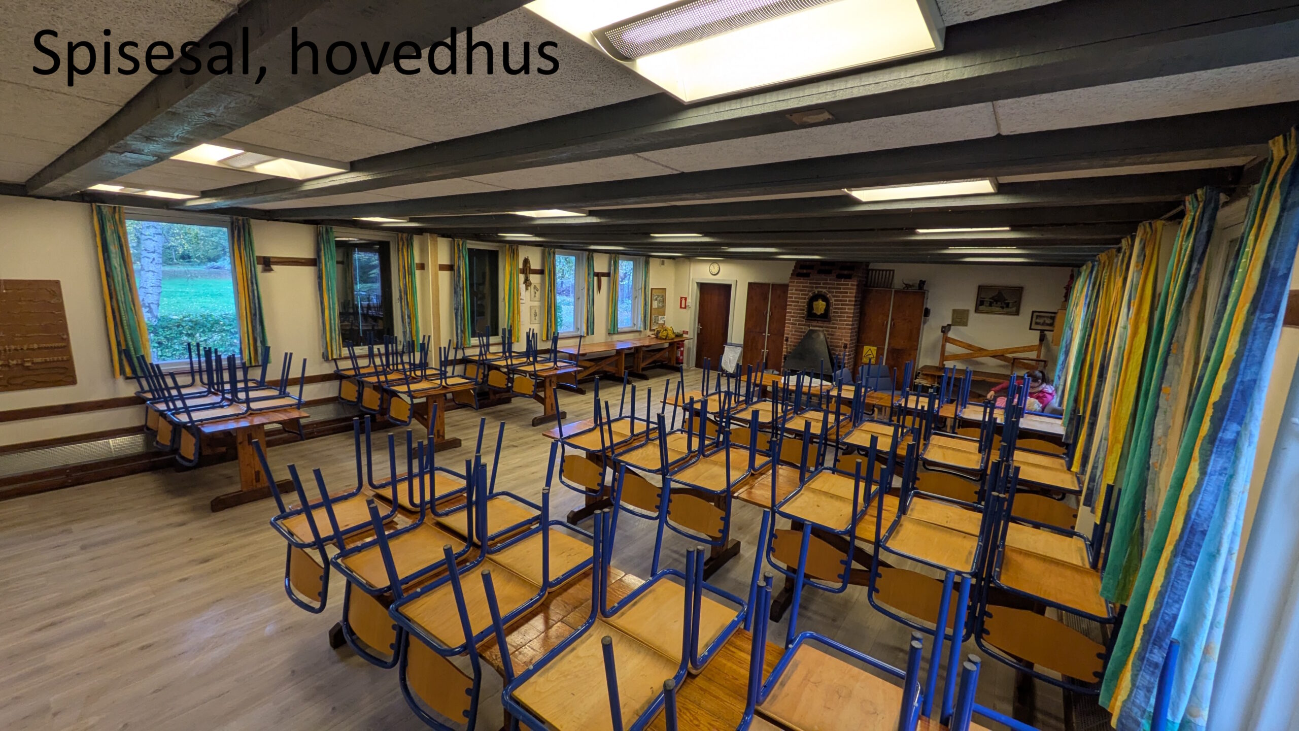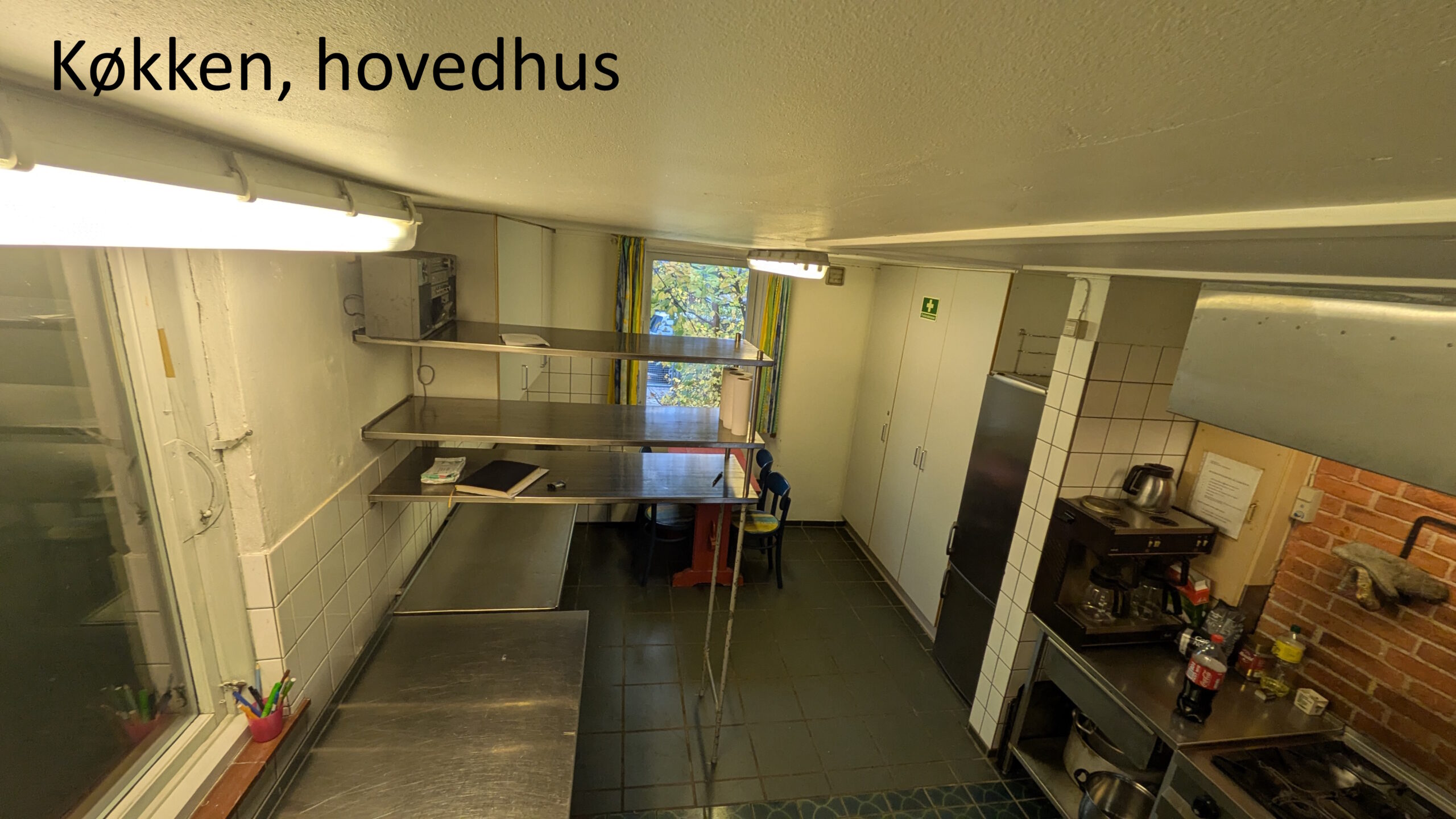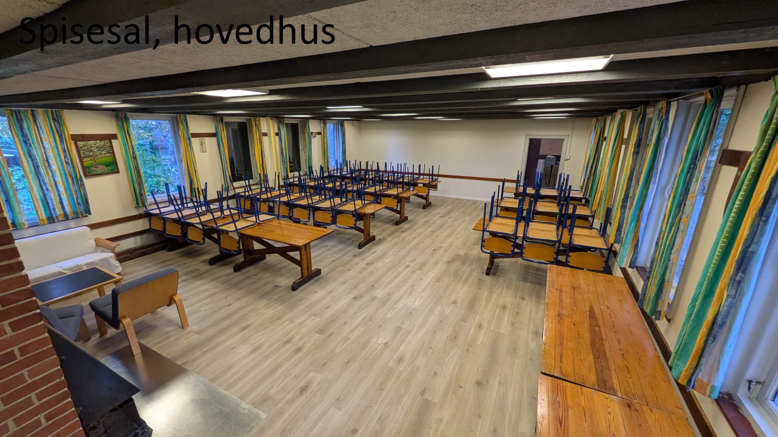 Hovedhuset – køkken, spisesal (30-50 pers) og et mindre soverum (10-15 pers). Huset har i 2025 fået et nyt gulv i spisesalen og termoruder, et projekt der blev støttet af Nykredit fonden.