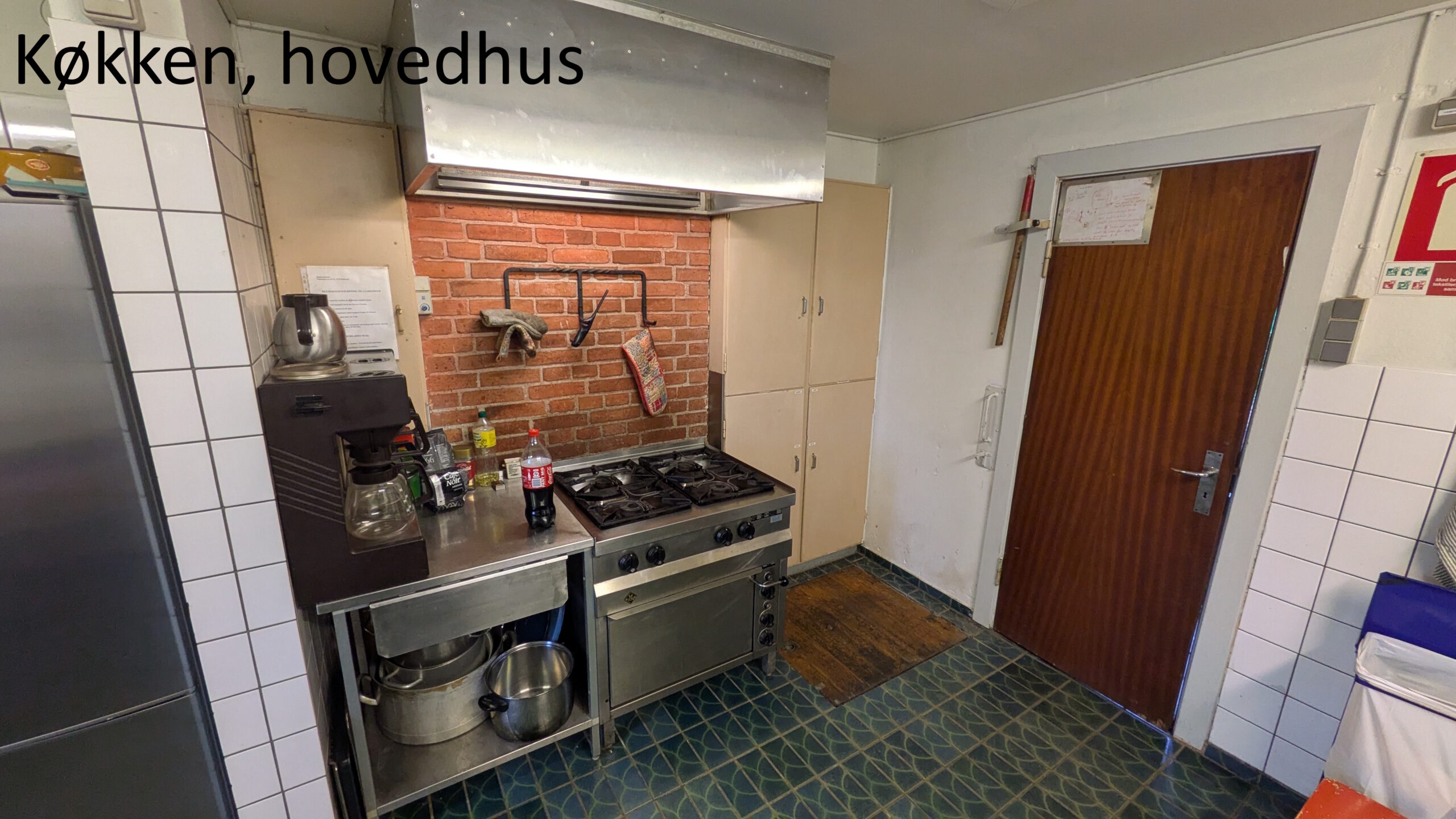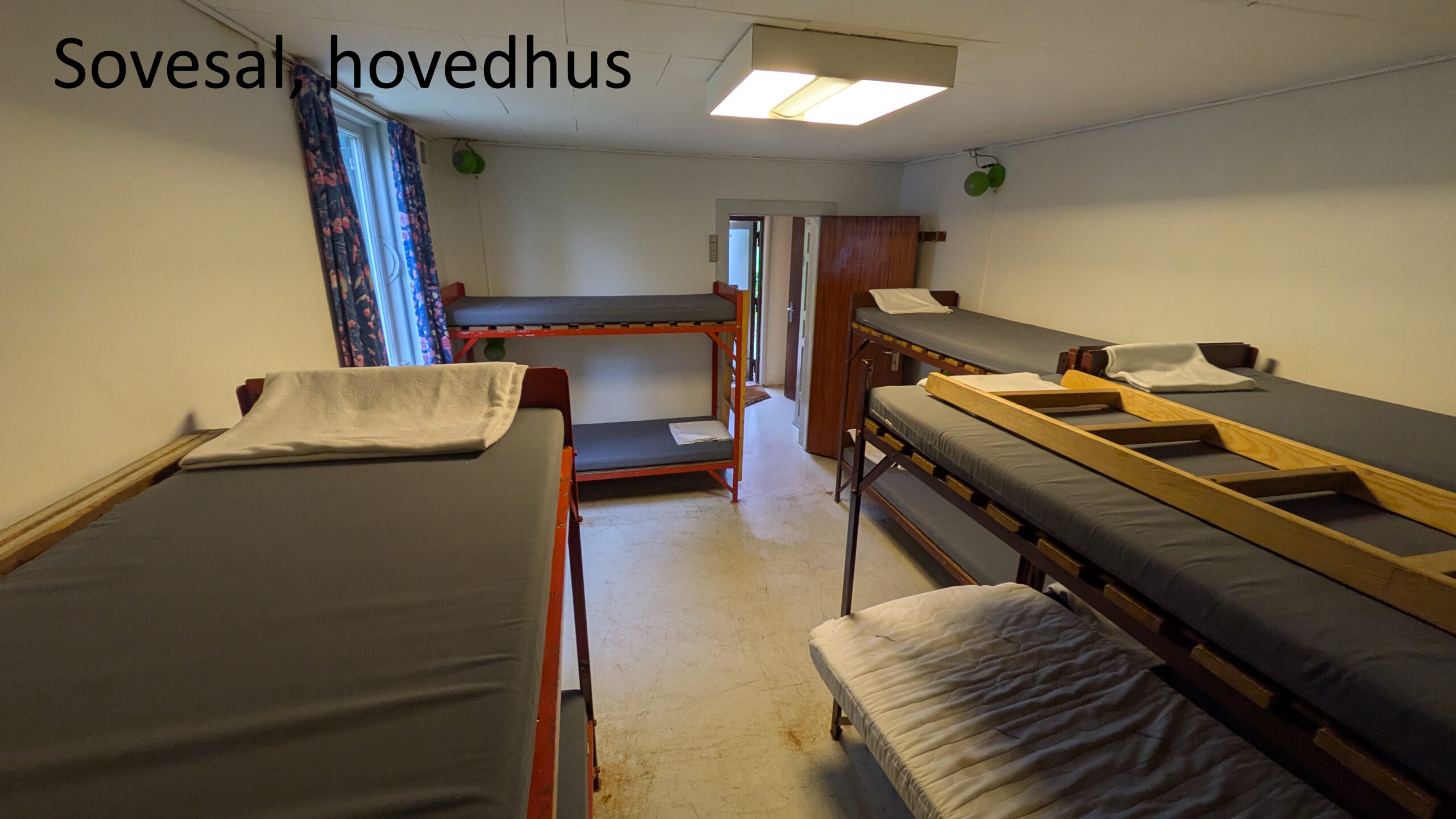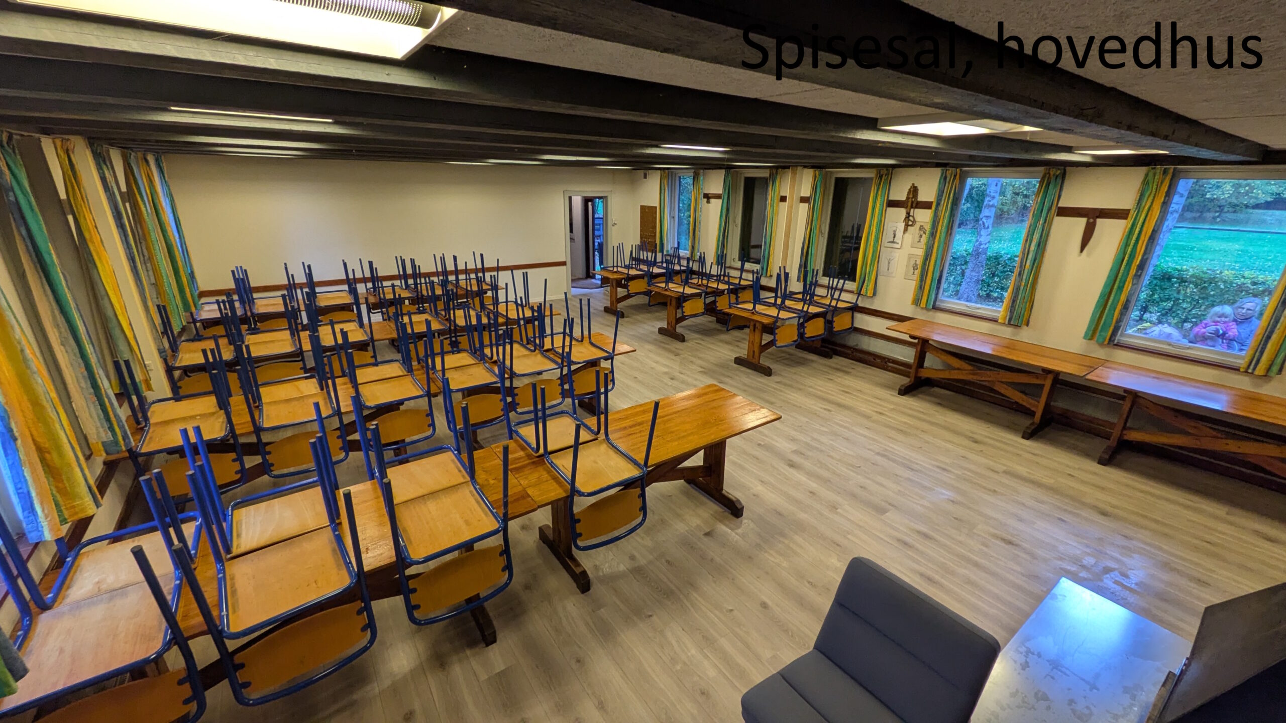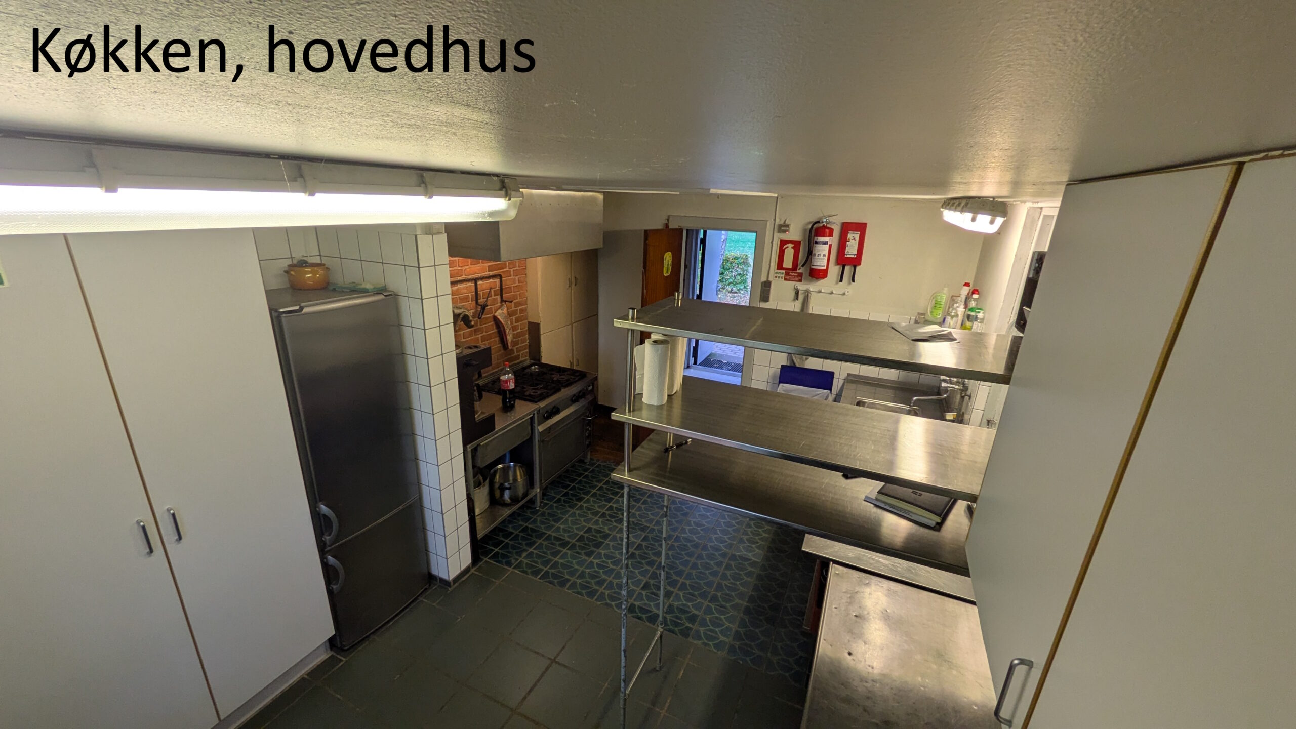 Hovedhuset – køkken, spisesal (30-50 pers) og et mindre soverum (10-15 pers). Huset har i 2025 fået et nyt gulv i spisesalen og termoruder, et projekt der blev støttet af Nykredit fonden.